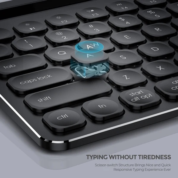 2.4G無線和雙藍牙模式為您的連接提供更多選擇。只需一鍵, 即可輕鬆實現3種不同類型設備之間的平滑切換,滿足您同時使用多台設備的需求。 不論是切换手機,PC,Mac機裝置,只需按一鍵就可以,非常簡單方便 可充電無線鍵盤內置 200 mA 高效鋰電池,可保持 2 個月的電量充足。 沒電時,指示燈會快速閃爍提醒您,只需2小時即可充滿電。 水滴鍵帽完美貼合您的手指,帶來打字的舒適感。 纖薄無線鍵盤採用剪刀式開關結構,使觸覺回應更快,打字更安靜,有效提高工作效率。此外,水滴鍵帽完美貼合您的手指, 帶來打字的舒適感。 時尚而堅固的金屬面板可以穩定放置,因此您可以隨心所欲地在上面打字,而不必擔心晃動。此外,集成支架為您提供更完 美的無線體驗,讓您同時握住智慧手機和平板電腦。 ViCTSING無線+藍牙鍵盤 型號PC303A • 藍牙/2.4G • 瞬間可切換3裝置 • 支援Window,Mac,iOS & Android • 200mAh電池可,待用2個月 • 鋁合盒外壳,堅固又輕盈 • 槽位可用於15”平板電腦 • 鉸剪脚结構軸,,輕鬆回弹 • 水滴式的鍵帽,打字更舒適 2.4G wireless and dual Bluetooth mode provide more choices for your connection. Just one click, You can easily achieve smooth switching between 3 different types of devices to meet your needs for using multiple devices at the same time. Whether you are switching between mobile phone, PC, and Mac devices, you only need to press one button. It is very simple and convenient. The rechargeable wireless keyboard has a built-in 200 mA high-efficiency lithium battery that can maintain a full charge for 2 months. When the battery is out of power, the indicator light will flash quickly to remind you, and it only takes 2 hours to fully charge. The water drop keycaps fit your fingers perfectly for typing comfort. The slim wireless keyboard adopts a scissor switch structure, which enables faster tactile response and quieter typing, effectively improving work efficiency. In addition, the water drop keycaps fit your fingers perfectly, Brings typing comfort. The stylish yet sturdy metal panel is stable so you can type on it to your heart's content without worrying about wobbling. In addition, the integrated stand gives you a more complete Midea's wireless experience allows you to hold your smartphone and tablet at the same time. ViCTSING Wireless + Bluetooth Keyboard Model PC303A • Bluetooth/2.4G • Switch between 3 devices instantly • Supports Window,Mac,iOS & Android • 200mAh battery, can be used for 2 months • Aluminum box casing, strong and light • Slot available for 15” tablet • Structural shaft of scissor feet, easy to rebound • Water drop type keycaps make typing more comfortable